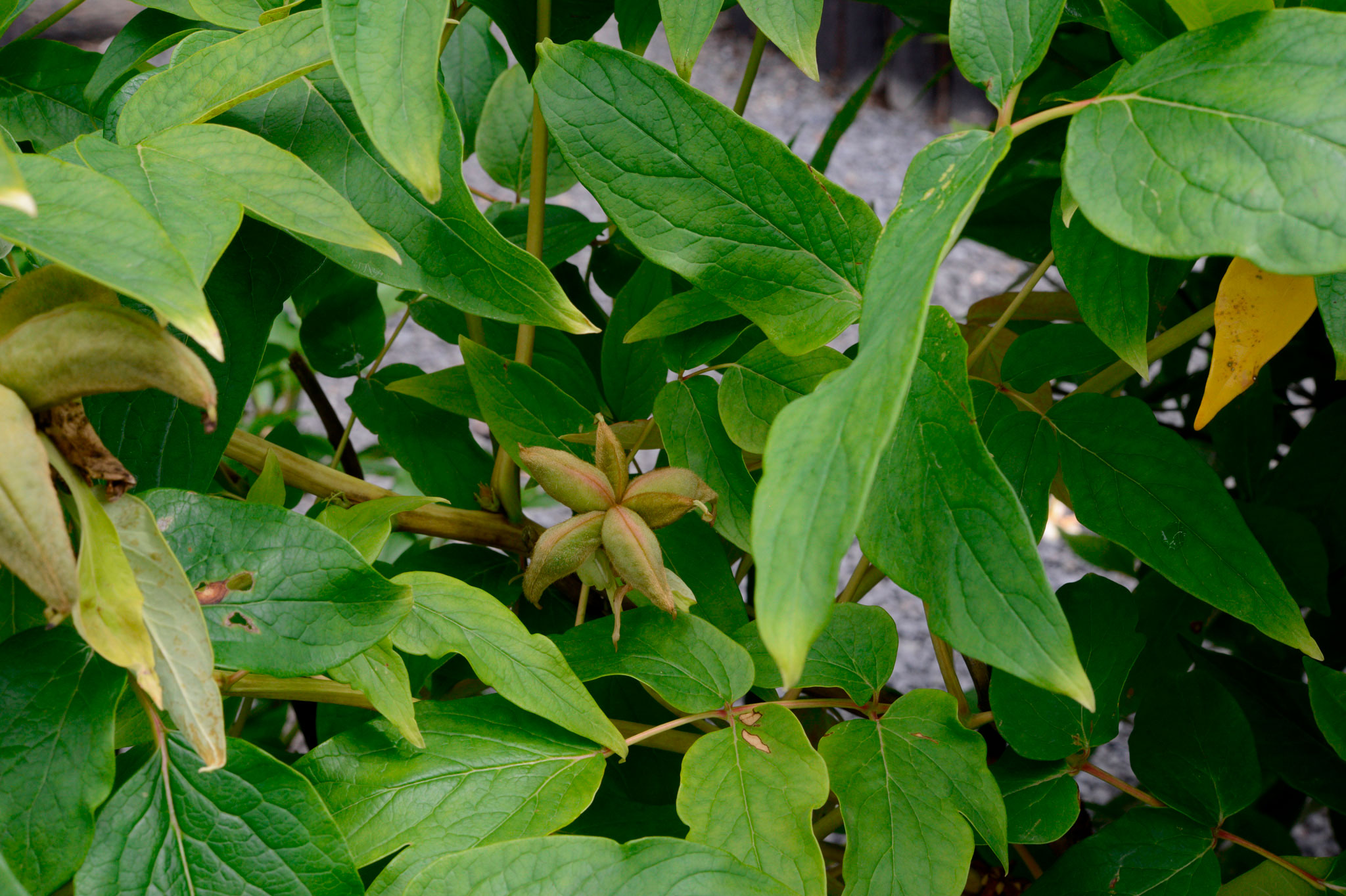 ボタンの葉は1回3出羽状分裂し、小葉は卵形から披針形をしており、葉先は2 - 3裂するか全縁です。