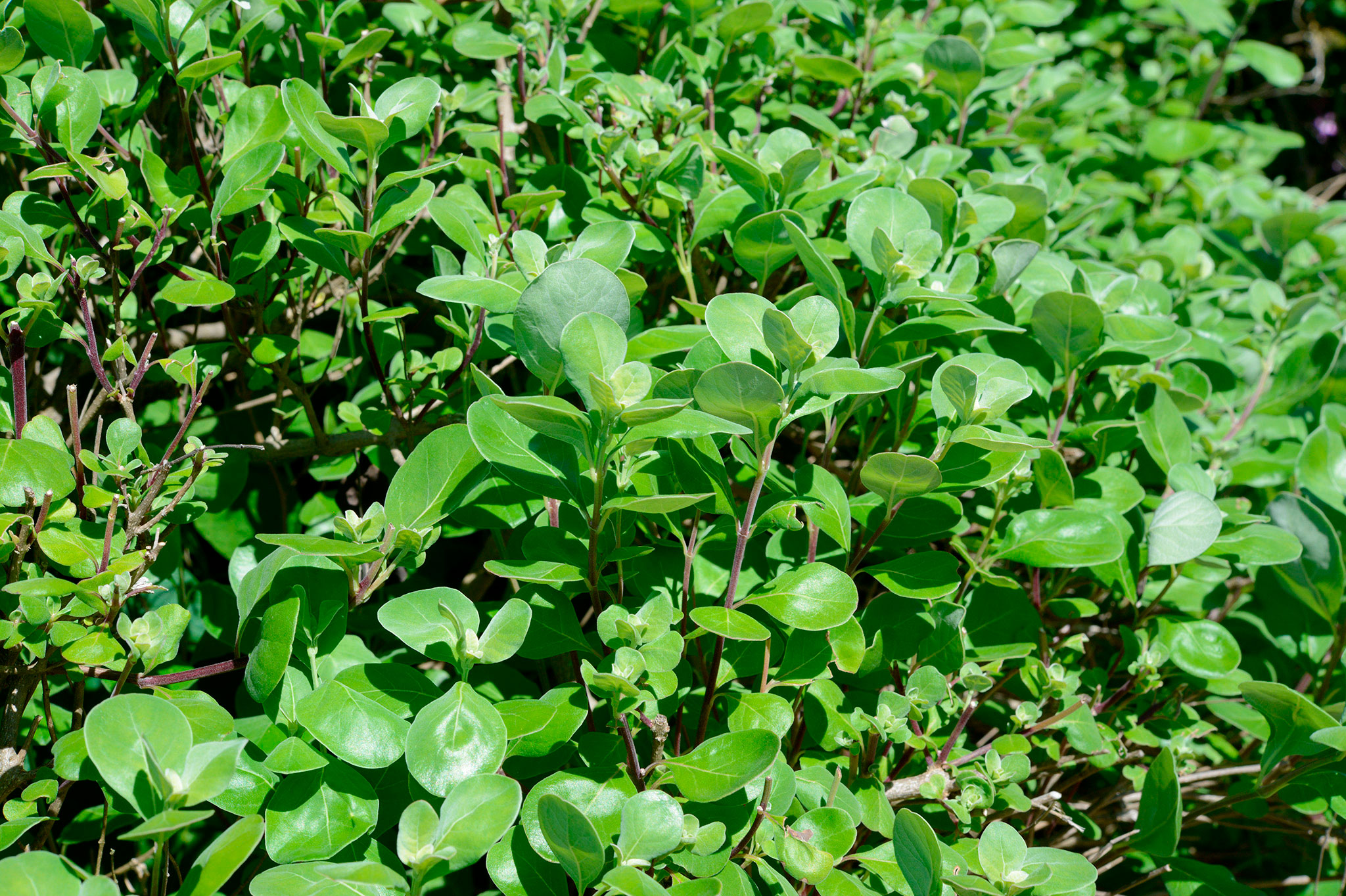 暖地の海岸砂地などに群生、地上をはって伸びます。茎から30~60cmほどの枝を直上します。葉の表面は緑色ですが、裏面には柔らかい細毛が密生し灰白色にみえます。