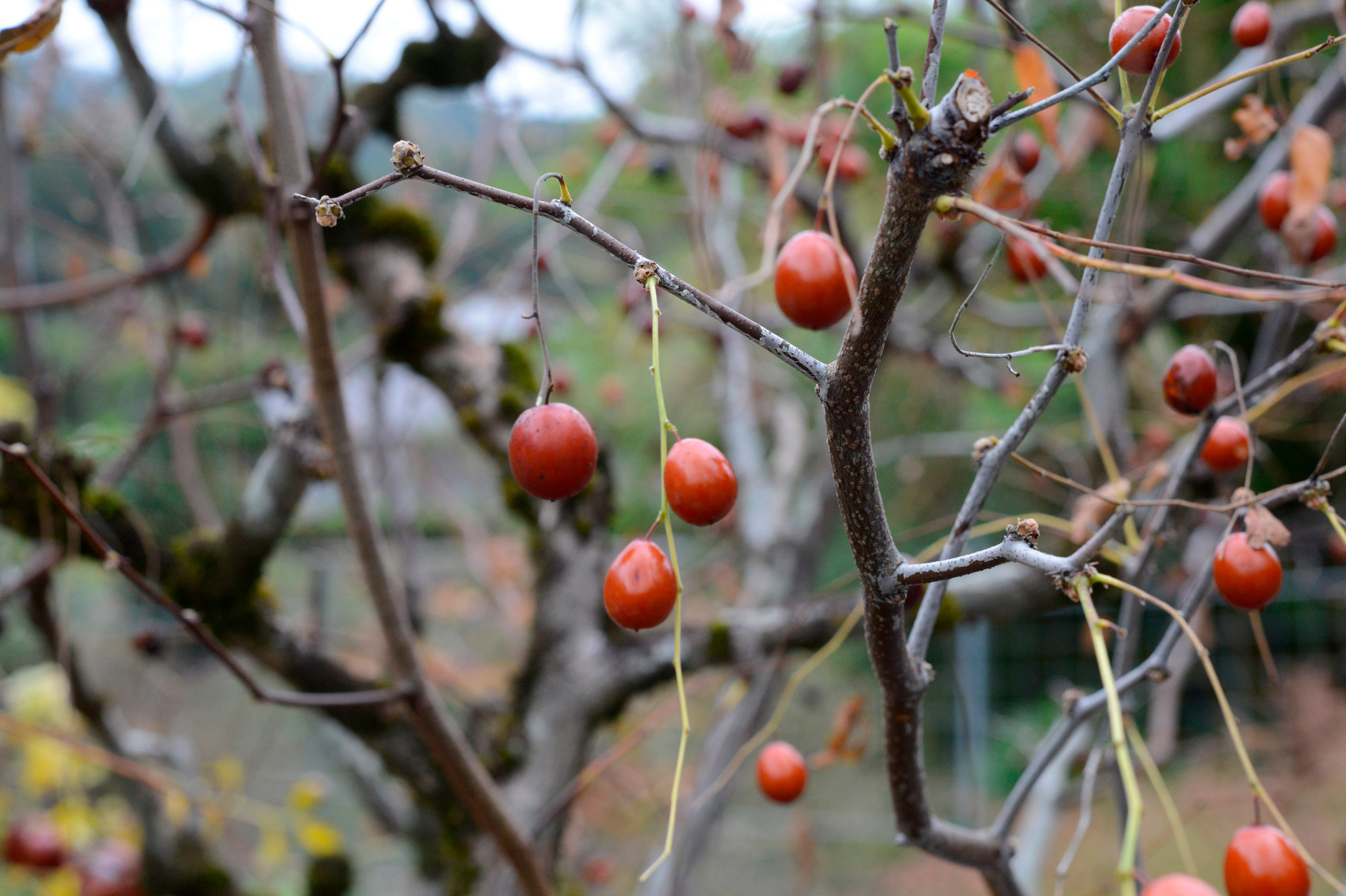 枝は暗褐色で節が膨らみ、節から2~3本の枝が伸び、托葉が変化したトゲがあります。近縁のナツメにはトゲがありません。