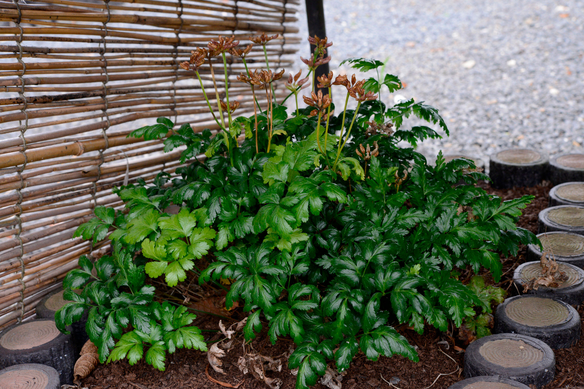 根茎は短くて地中を斜めに這い、黄味を帯びています。葉は三角状で,いくつもの深い切れ込みがあります。